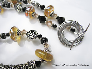 Oh man, this one is killer. To start off, there is an AWESOME focal bead made by my dear friend Carey. Then, there are black organic seeds made by Jenelle of SFD. Along with those are some golden amber discs made by Polychrome Beads. Accented by Jet and Light Colorado Topaz Swarovski Crystals, Spiral beads and twisted spacers. The silver toggle tops it off and below are the matching earrings.